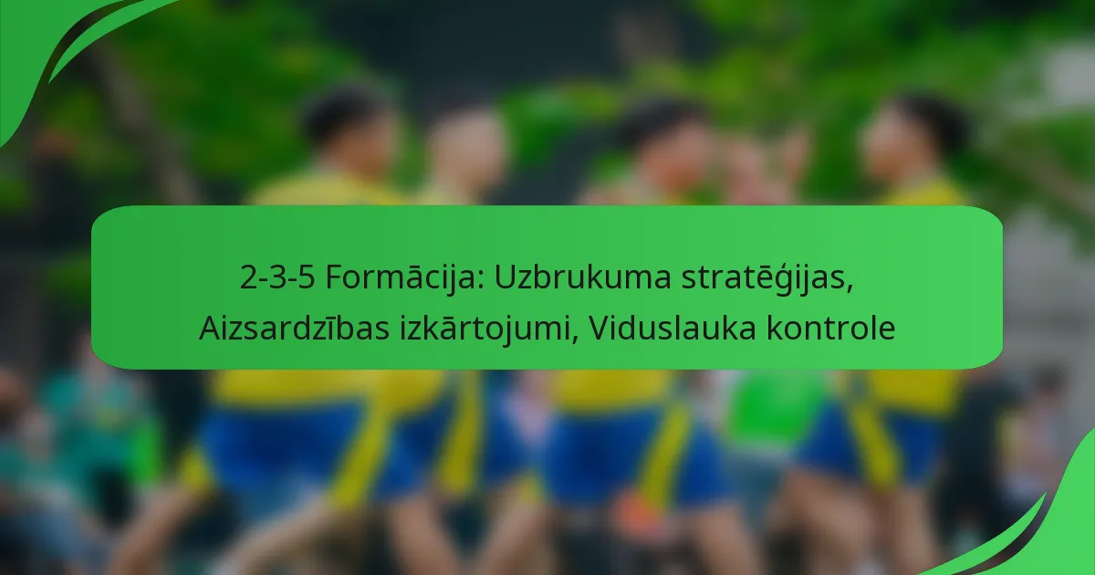 2-3-5 formācija ir klasiskā futbola stratēģija, kas ietver divus aizsargus, trīs pussargus un piecus uzbrucējus, prioritizējot agresīvu uzbrukuma spēli. Šis izkārtojums ne tikai maksimizē vārtu gūšanas iespējas, bet arī nodrošina kontroli pār pussargu līniju, lai atbalstītu gan uzbrukuma pārejas, gan aizsardzības pienākumus. Efektīvas aizsardzības stratēģijas šajā formācijā prasa spēcīgu komunikāciju un pielāgojamību starp spēlētājiem, lai pretotos pretinieku kustībām.